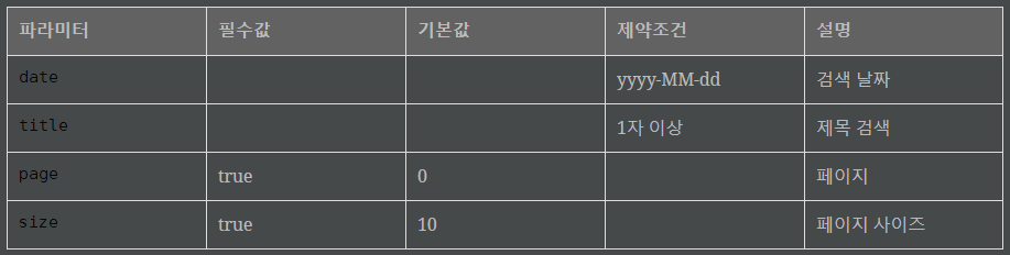 spring rest docs를 이용해 메시지 바디로 들어오는 값(requestFields)을 테스트한다면 request-fields 스니펫이 생성된다. 마찬가지로 queryParameters를 테스트하면 query-parameters 스니펫이 생된된다.