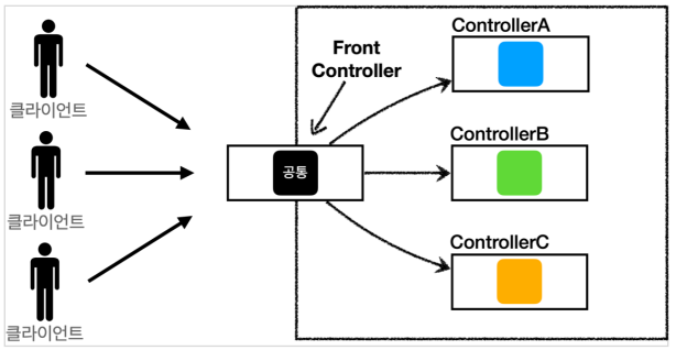 프론트 컨트롤러 패턴은 중앙 집중형 컨트롤러를 제일 앞단에 두고 모든 요청을 받는다. 디스패처 서블릿이 프론트 컨트롤러 패턴으로 구현되었으며 요청에 맞는 컨트롤러를 찾아서 호출하고 응답을 받아 뷰를 만든다.