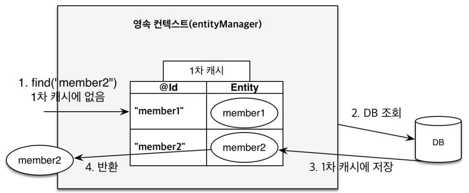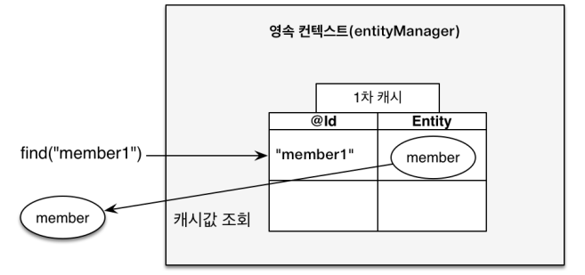 em.find()를 호출하면 먼저 1차 캐시에서 엔티티를 찾고 만약 찾는 엔티티가 1차 캐시에 없으면 데이터베이스에서 조회한다.