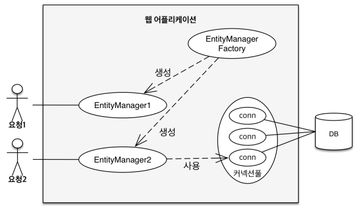 이때, 엔티티 매니저는 데이터베이스 커넥션과 밀접한 관계가 있으므로 스레드간에 공유하거나 재사용해서는 안 된다.