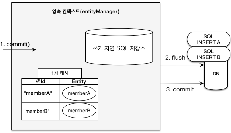 두 개의 엔티티를 영속화하여 두 건의 insert 쿼리가 쓰기 지연 SQL 저장소에 저장되어 있다. 트랜잭션을 커밋하면 엔티티 매니저는 영속성 컨텍스트를 플러시한다. 쓰기 지연 SQL 저장소에 모인 쿼리를 데이터베이스에 보내고 영속성 컨텍스트의 변경 내용이 데이터베이스와 동기화 된다. 이후 실제 데이터베이스 트랜잭션을 커밋한다.