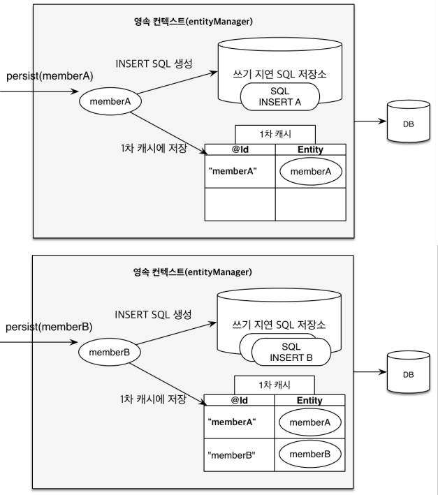엔티티 매니저는 트랜잭션을 커밋하기 직전까지 데이터베이스에 인티티를 저장하지 않고 내부 쿼리 저장소에 INSERT SQL을 차곡차곡 모아둔다. 그리고 트랜잭션 커밋 시점에 모아둔 쿼리를 데이터베이스에 보내는데 이를 트랜잭션을 지원하는 쓰기 지연(transaction write-behind)이라 한다.