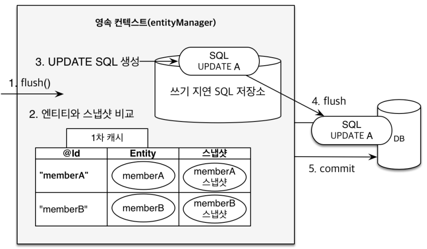 - 변경 감지가 동작해서 영속성 컨텍스트에 있는 모든 엔티티를 스냅샷과 비교해서 수정된 엔티티를 찾는다. 수정된 엔티티는 수정 쿼리를 만들어 쓰기 지연 SQL 저장소에 등록한다.