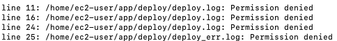 배포가 성공한 것을 확인할 수는 있지만 권한 오류가 빵빵 터지면서 정상적으로 로그 파일에 접근하지 못하는 것 또한 확인할 수 있습니다.