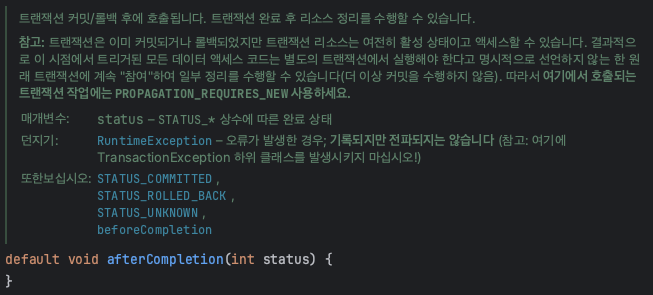 주석에서 설명한는대로 TransactionSynchronization.afterCompletion(int) 메서드의 주석을 확인해보면 좀 더 상세한 내용을 확인할 수 있습니다.