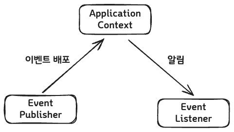 스프링 이벤트의 발행은 이벤트를 발행 -> 애플리케이션 컨텍스트에 배포 -> 이벤트 리스너에 알림 세 단계로 구성되어 있음을 알 수 있습니다.