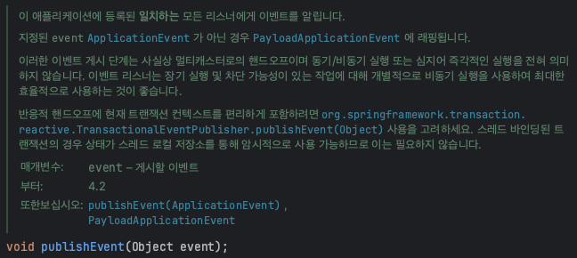 ApplicationEventPublisher를 확인해보면 PayloadApplicationEvent가 임의의 이벤트 객체를 래핑해준다는 것을 확인할 수 있습니다.