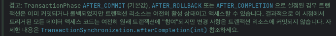 BEFORE_COMMITAFTER_COMMIT(기본값)AFTER_ROLLBACKAFTER_COMPLETION(트랜잭션 완료, 커밋 + 롤백)