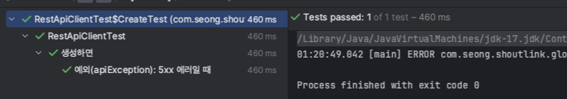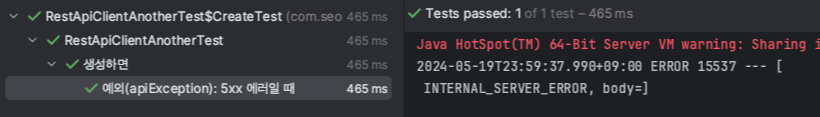 테스트 실행 시 다음과 같이 상태 코드가 500인 응답이 정상적으로 반환된 것을 확인할 수 있습니다.