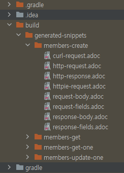 테스트 통과 후 build/generated_snippets 아래에 지정한 이름에 따른 문서들이 생성된다.