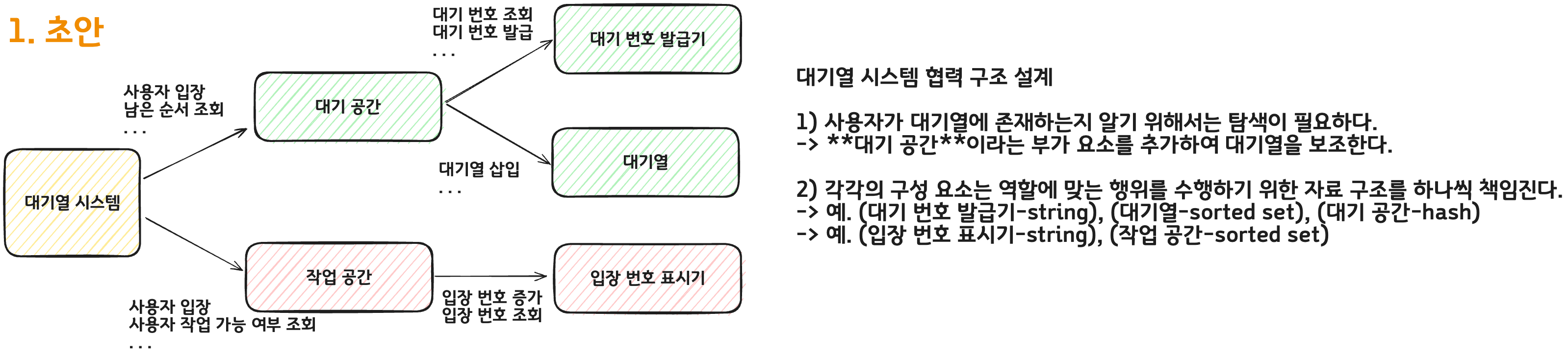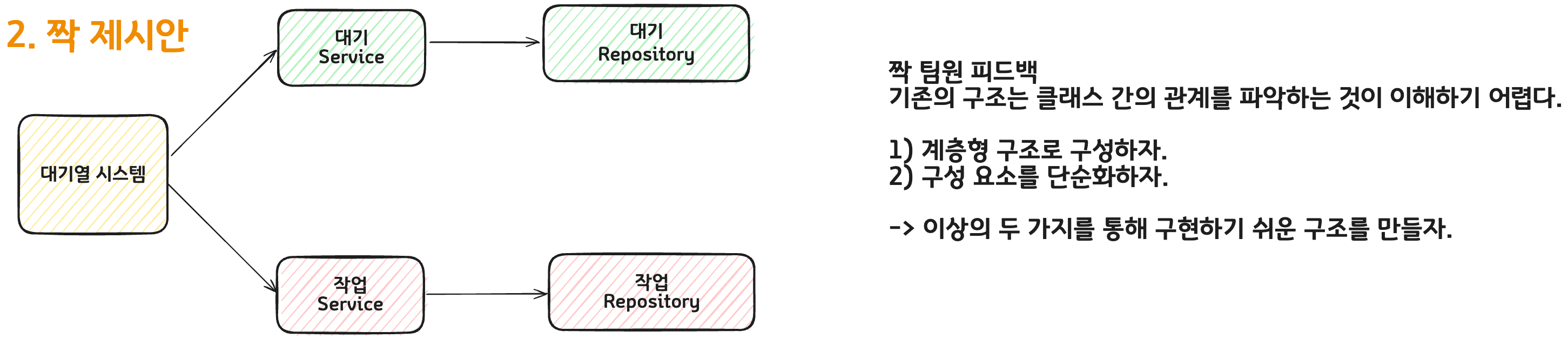 초안을 바탕으로 저는 Redis를 이용한 대기열을, 짝 팀원은 Java 자료 구조를 이용한 대기열을 담당했습니다. 각자 구현을 진행하고 하루가 지난 시점에 짝 팀원은 '현재의 구조가 이해하기 어렵다.'라는 의견을 전해왔습니다. 의견과 함께 새롭게 제시한 구조는 다음과 같습니다.