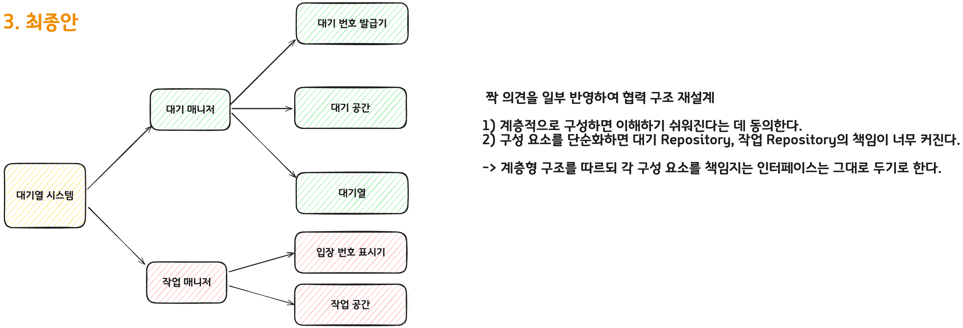최종안은 짝 팀원의 의견에 따라 계층형 구조로 변경하였습니다. 명확히 계층을 나눈다면 좀 더 이해하기 쉬울 수 있다고 생각했습니다. 다만, 구성 요소는 기존과 동일하게 책임에 따라 인터페이스를 나누는 것으로 합의하였습니다. 이러한 상호 의견 조율 통해 좀 더 이해하기 쉬우면서 책임 분리도 고려한 협력 구조를 완성하였습니다.