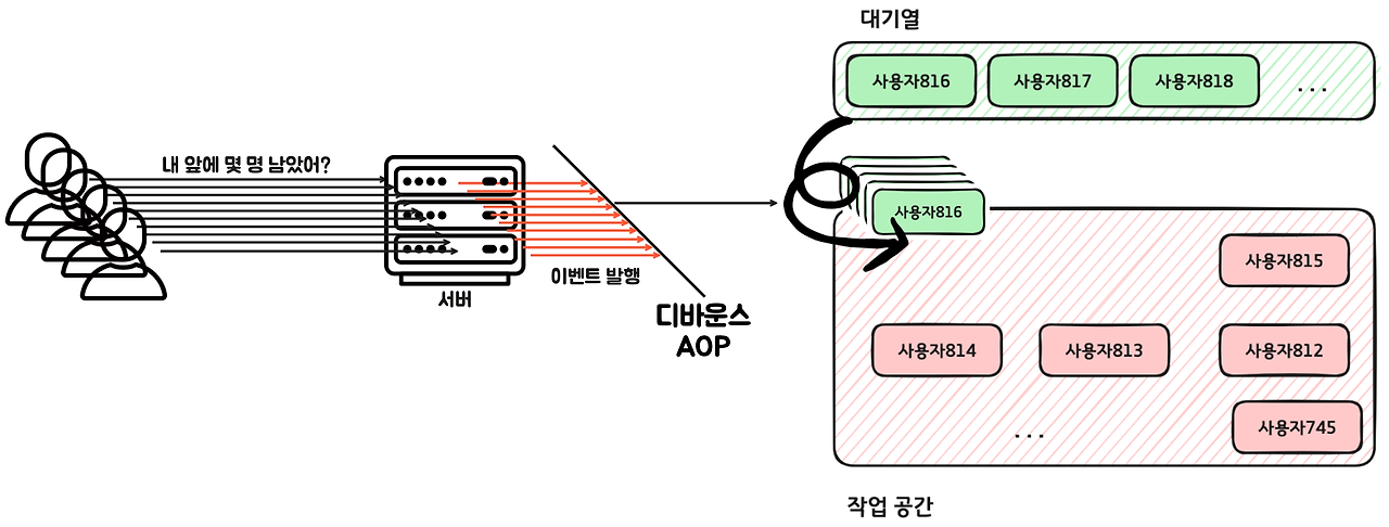이를 해결하기 위해 고민하던 중 디바운스라는 키워드를 떠올렸습니다. 사용자의 요청을 모아뒀다가 한 번만 실행시키는 겁니다. 수천 개의 요청 중 오직 하나의 요청이 작업 공간의 빈 자리만큼 대기열의 사용자를 빼서 작업 공간으로 이동시키는 겁니다. 사용자의 실제 요청이 있을 때만 일정한 주기마다 작업이 실행되도록 만들어 첫 번째 문제를 해결할 수 있었습니다.