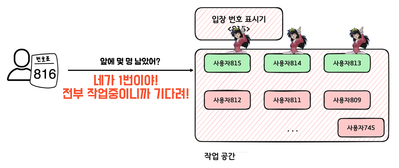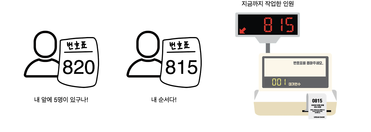 - 사용자는 은행원의 앞에 있는 빨간 번호 표시기의 숫자와 자신의 번호표를 비교해서 남은 순서를 파악합니다.