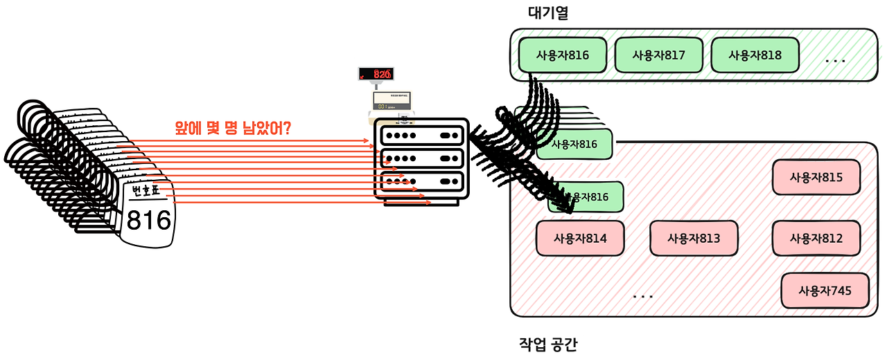 하지만 대기열 페이지에서 자기 순서를 물어보는 사용자는 수 천, 수 만명 일 것입니다. 그렇다면 대기열에서 작업 공간으로 옮겨주는 동작도 수천번 수행하게 되는 문제가 발생할 것이라고 예측할 수 있었습니다.