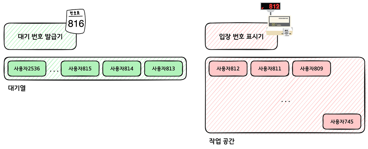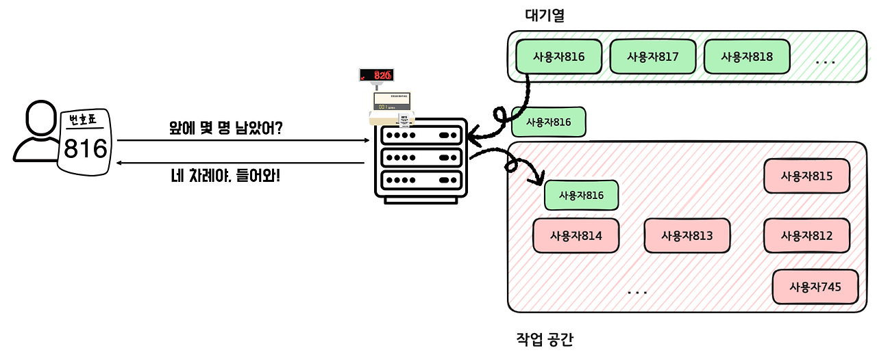 앞에서 설계 했던 것과 달리 대기 공간이라는 요소가 추가된 것을 볼 수 있습니다. 대기 공간은 대기열을 보조하기 위한 부가 요소입니다. 대기열을 구현하는 데 어떤 기술을 사용할지는 알 수 없지만 큐(Queue)와 유사한 자료 구조를 사용할 것임은 추측할 수 있었습니다. 이 때, 사용자가 대기열에 이미 입장 했는지 알기 위해서 필연적으로 큐를 탐색해야 할 것입니다. 이는 비효율적인 작업이라 생각했습니다. 따라서 대기 공간이라는 부가 요소를 뒀습니다. 대기열을 탐색하는 대신 맵(Map)을 이용해 사용자의 입장 여부를 바로 파악할 수 있게 하는 역할을 합니다.