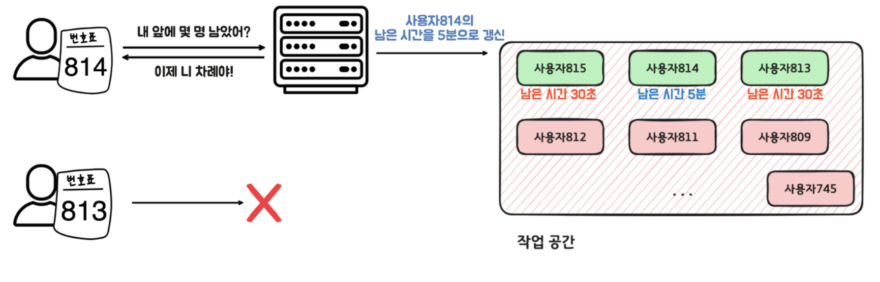 불필요한 동작을 줄이려면 사용자가 '자신의 남은 순서를 물어봤을 때', 작업 공간에 자리가 있는지 확인하고 대기열에서 빼주는 방법을 생각할 수 있었습니다.